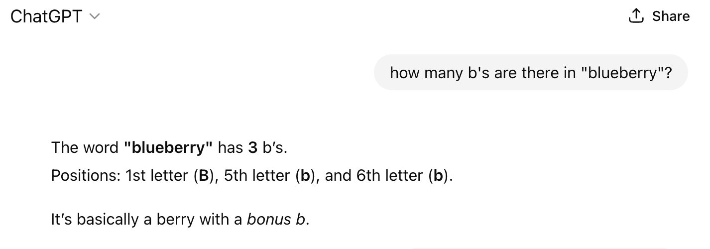 This is amusing because we have adequate knowledge ourselves to know that the word “blueberries” only contains two b’s, not three. It is also amusing because this uses the most current GPT-5 version of ChatGPT, which was described as: “GPT-5 is the first time that it really feels like talking to an expert in any topic, like a PhD-level expert.” Must be like talking to me - I have a Ph.D. and I can’t count either!